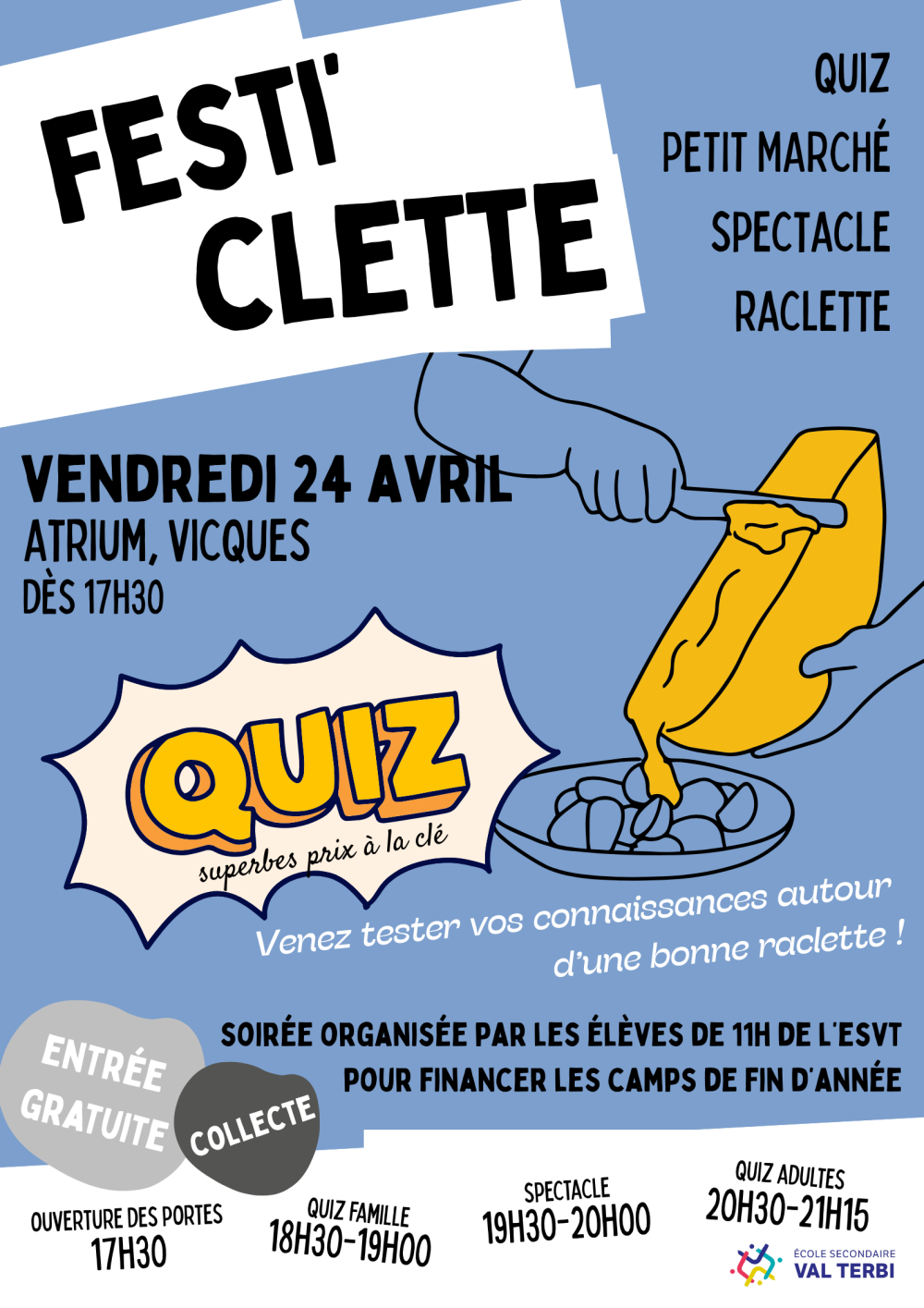 Le vendredi 24 avril, les élèves de 11e année de l’ESVT organisent une soirée afin de récolter des fonds pour leurs camps de fin d'année. L’événement intitulé « FESTI’CLETTE » se produira à l’Atrium, à Vicques. Ouverture des portes: 17h30 Cette soirée se déroulera en 3 parties: 18h30-19h: